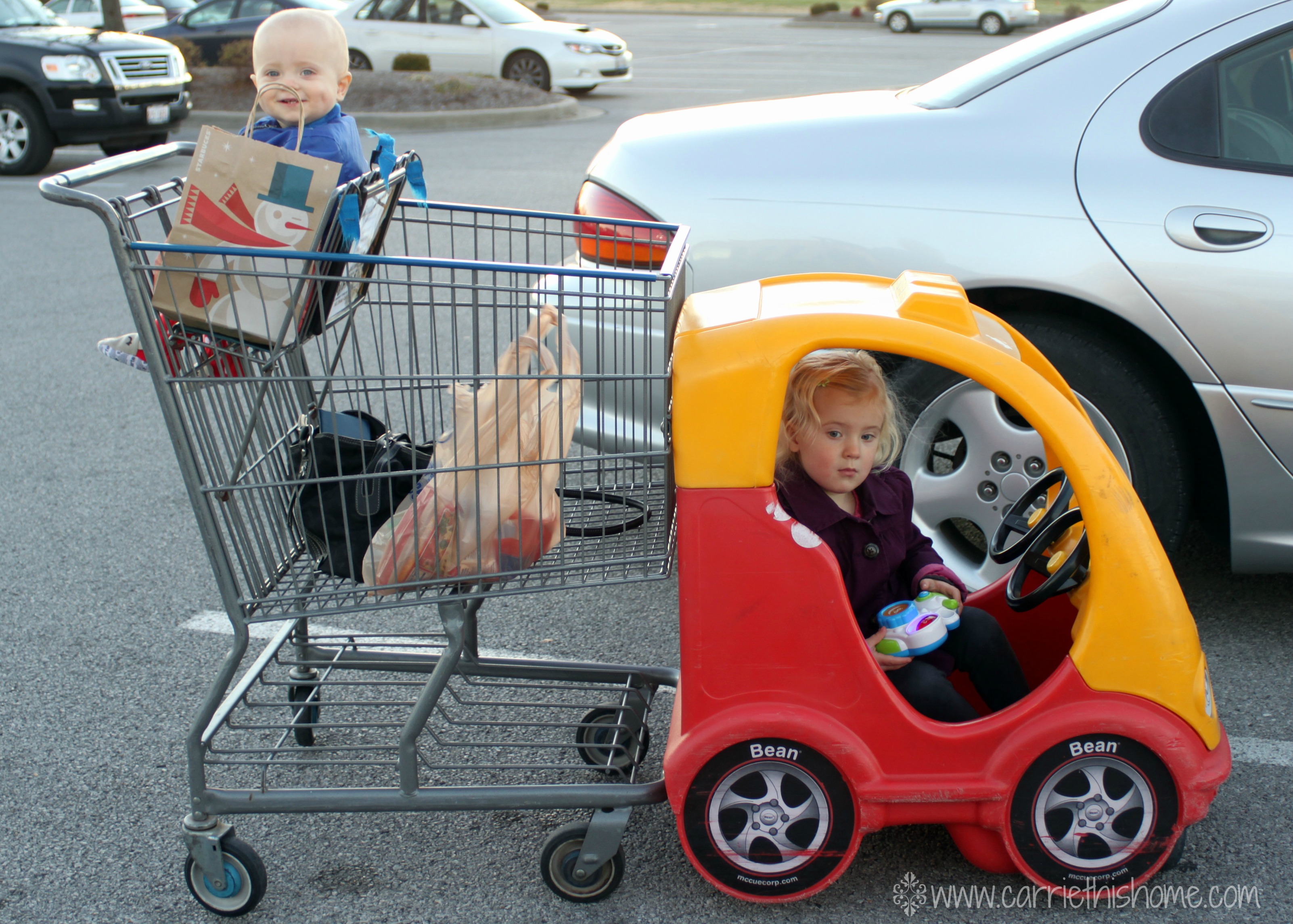 I have a love/hate relationship with these shopping carts. I love them because they help keep my kids happy and contained while I shop.