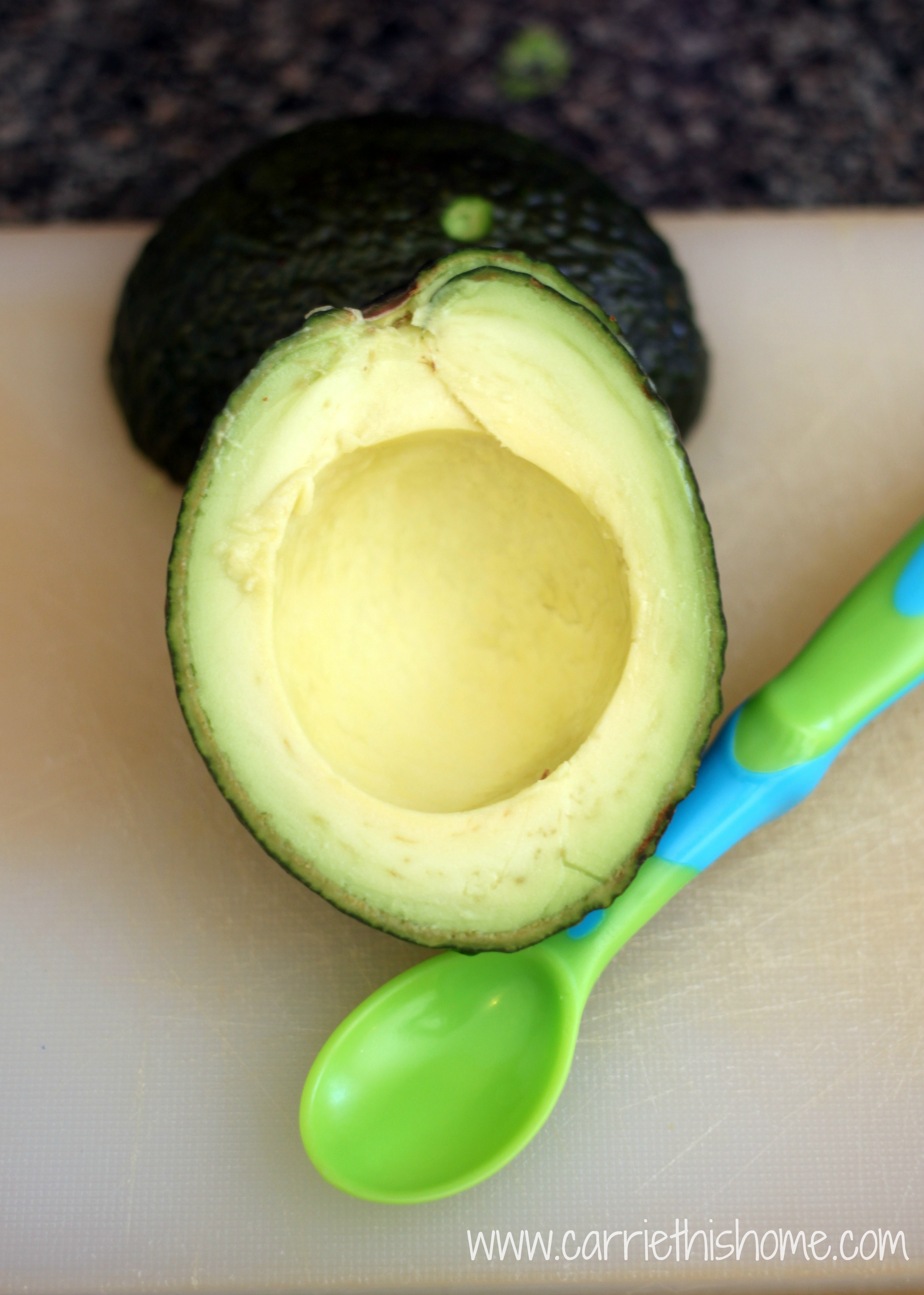 Avocado was Sayer’s first food when he was 6 months old. He loves it! He usually eats one or two a week. I chunk it up and put it on his tray and he shovels it in. 🙂